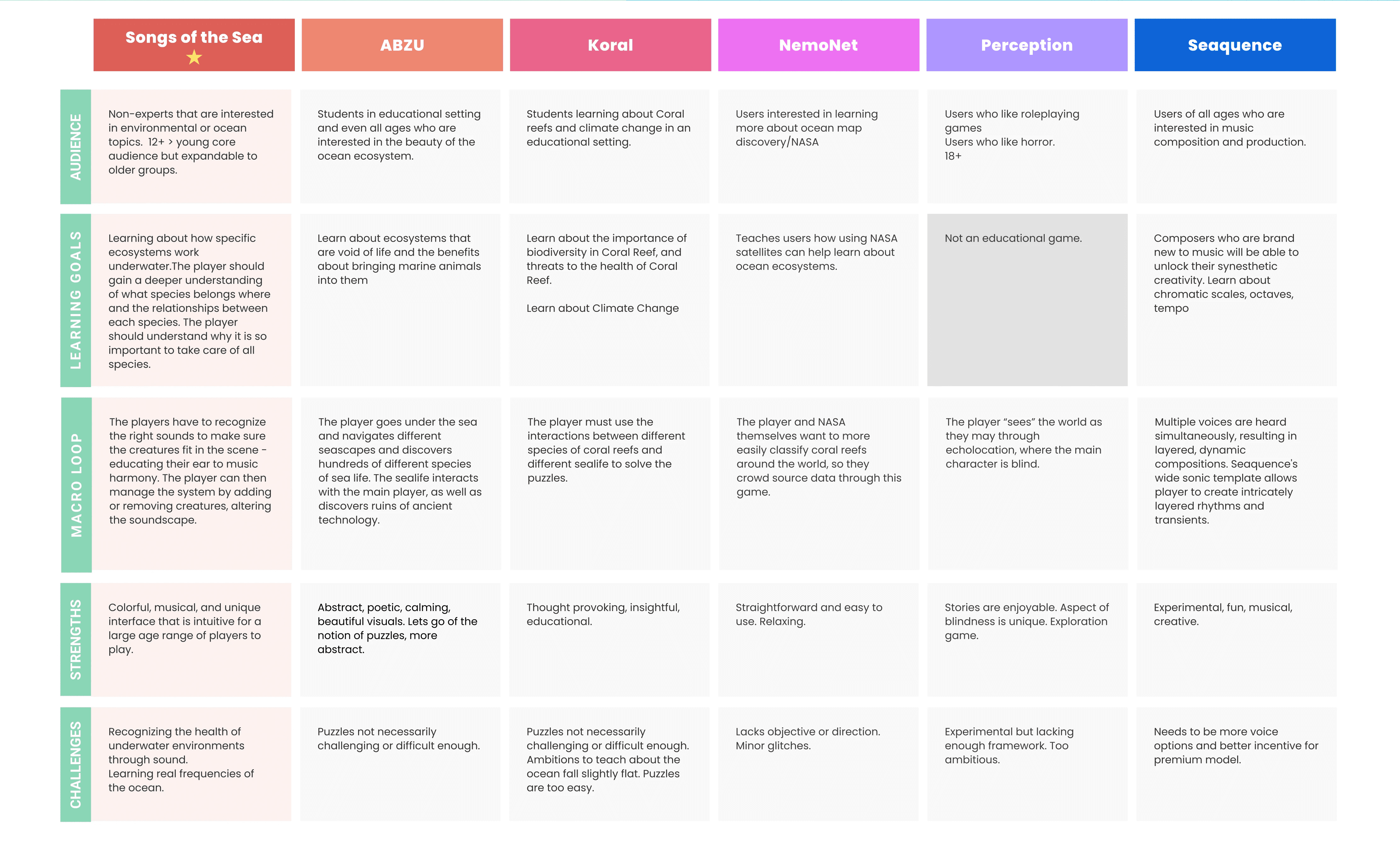 We analyzed five educational games within adjacent domains to understand how they approached learning, sound, and engagement. Our analysis revealed that most emphasized visuals or abstract soundscapes, with limited educational depth around ecosystem dynamics. This insight positioned Songs of the Sea as a game worth making—one that centers sound as a meaningful, research-driven mechanic for fostering ocean literacy.
