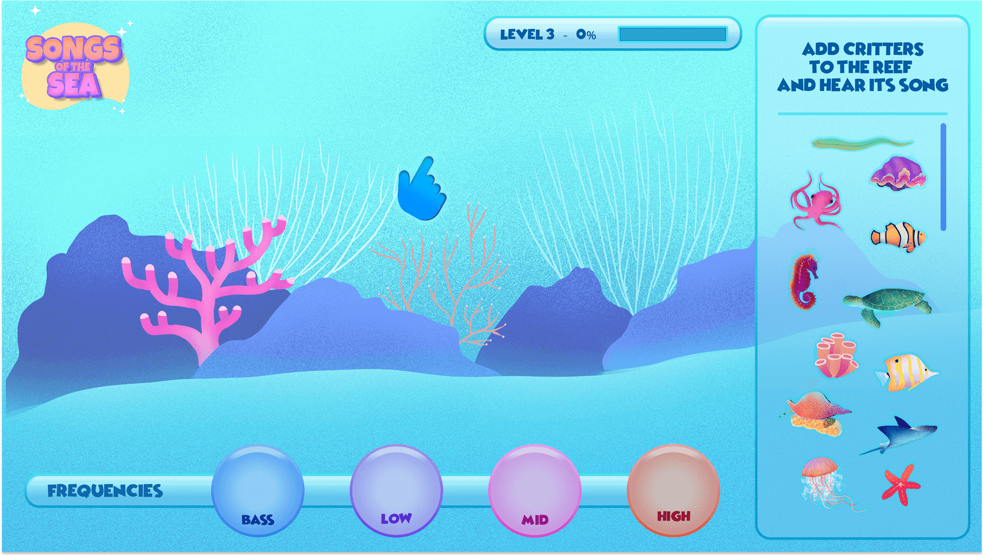 The core challenge of Songs of the Sea was designing an accessible way to teach a largely unfamiliar concept: the relationship between sound and ecosystem health in marine environments. Because ocean bioacoustics and ocean literacy are not widely understood, especially by younger audiences, we needed to translate complex scientific ideas into intuitive, engaging gameplay without assuming prior knowledge of music theory or ecology.